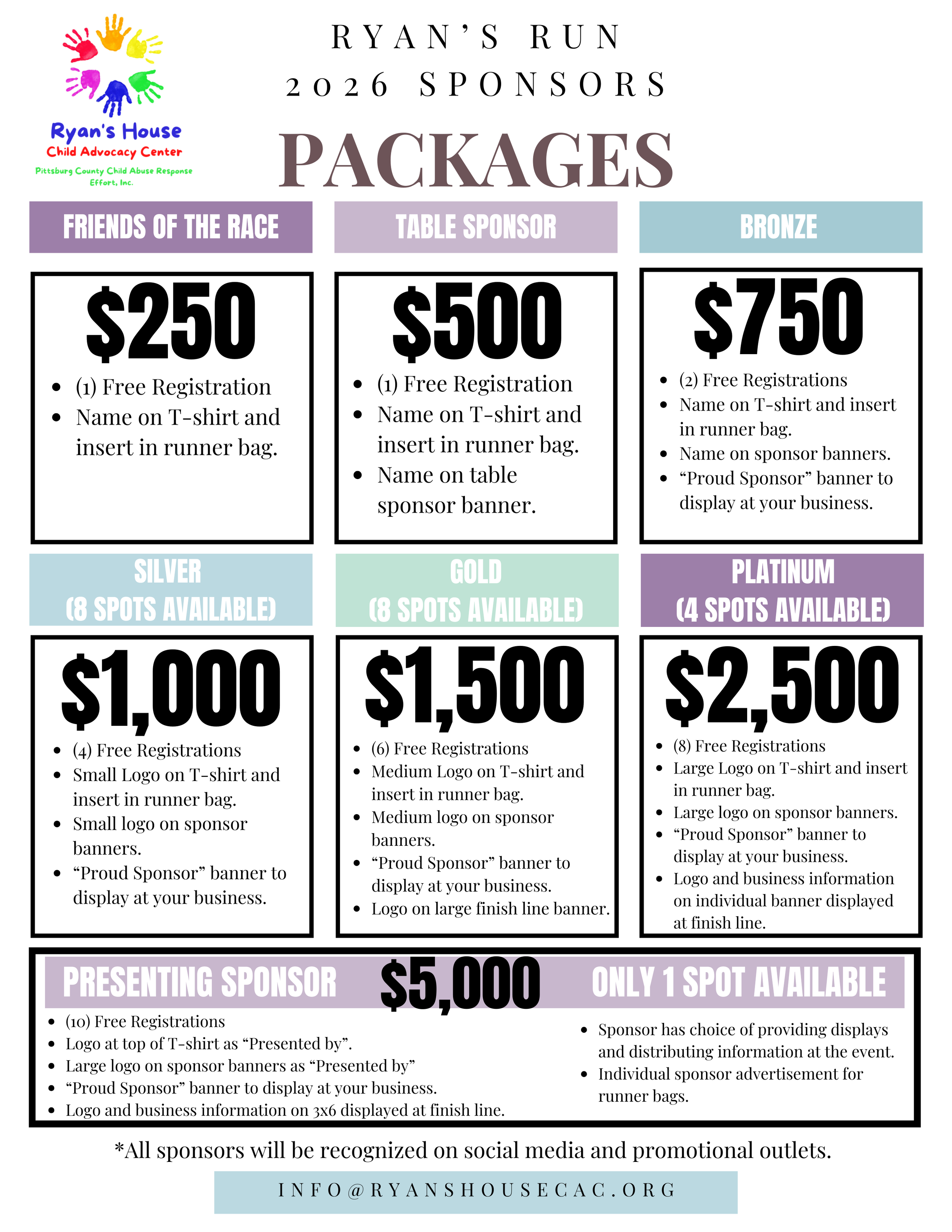 Once a sponsorship package is purchased, a sponsorship form will be emailed to collect the individual or company details needed for event promotions. Sponsors may also provide race registration information through this form if they wish to participate in Ryan’s Run.